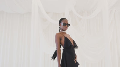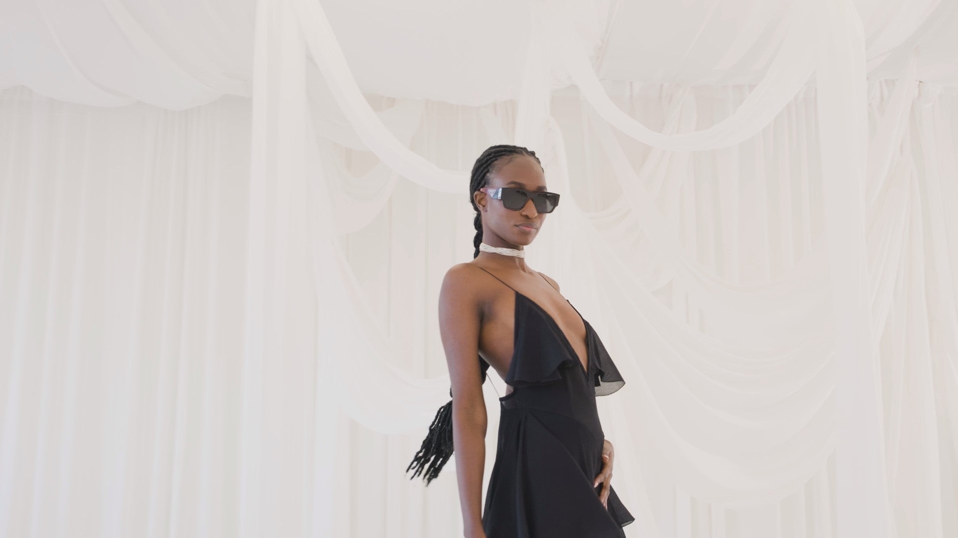 The design features a deep V-neckline and a sculpted sheer bodice - structured enough to contour, soft enough to feel undone in the right way. From the waist, cascading asymmetric layers flow into a voluminous, multi-tiered skirt. Sheer segments are thoughtfully placed to capture light, creating an interplay between opacity and transparency.